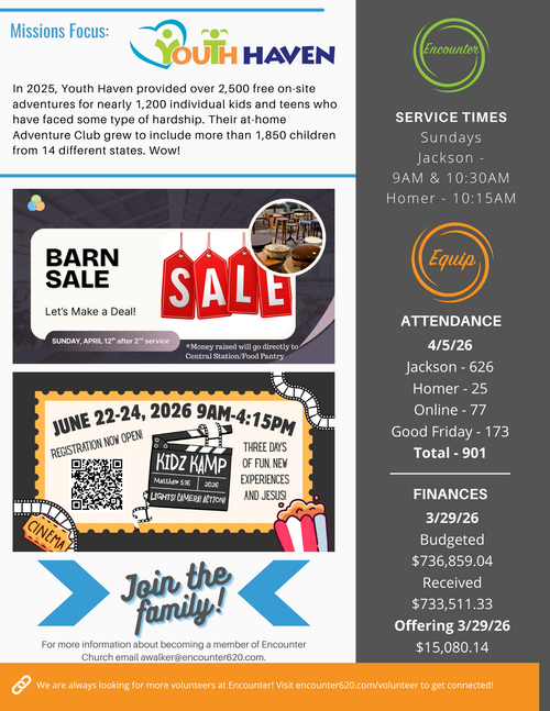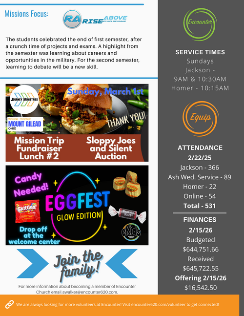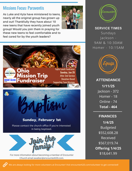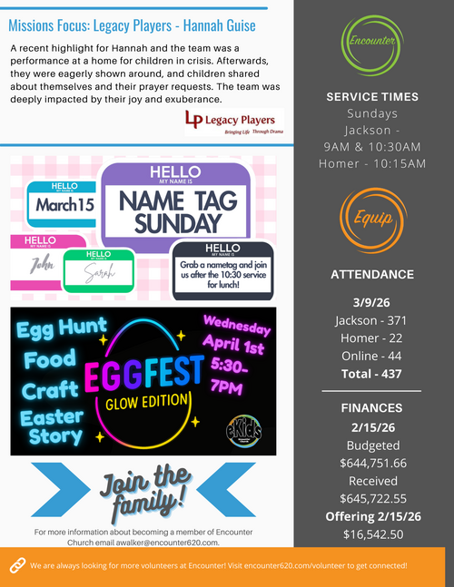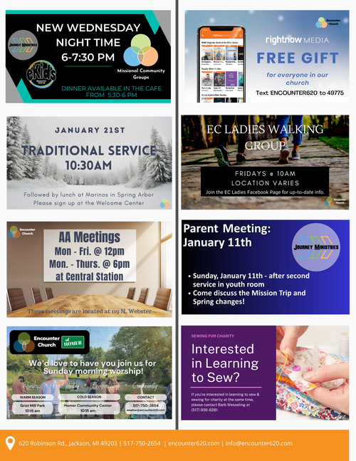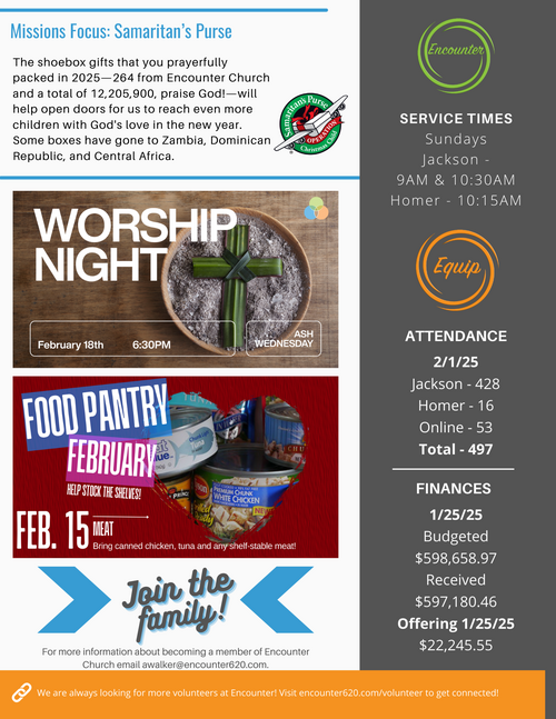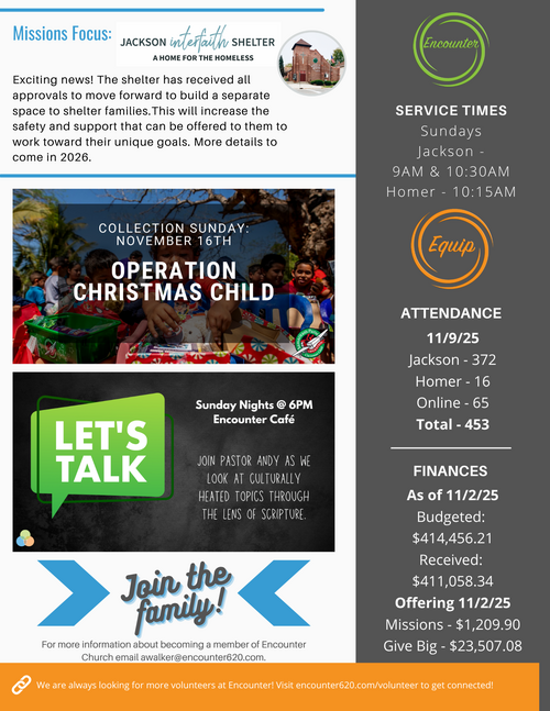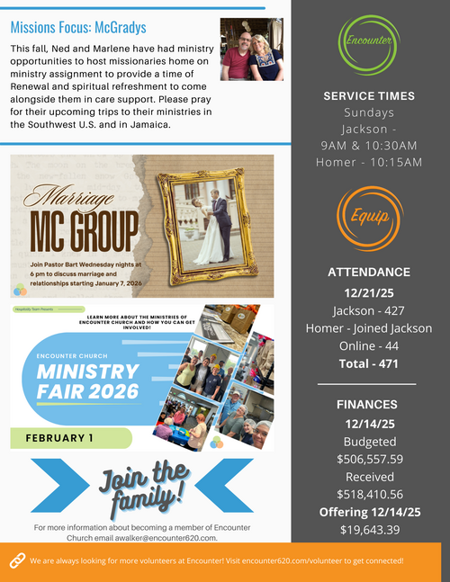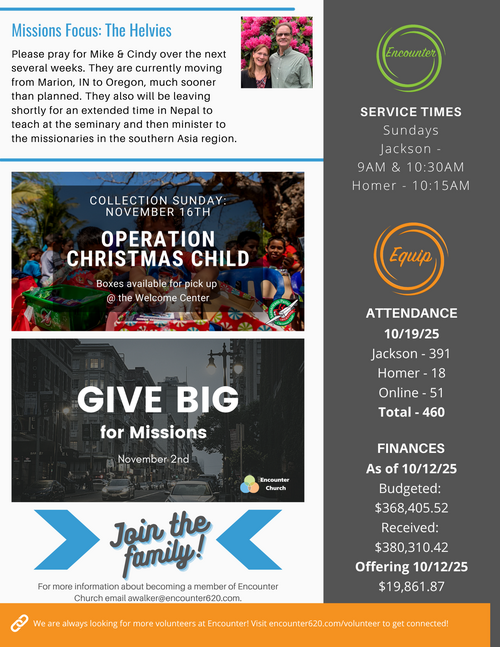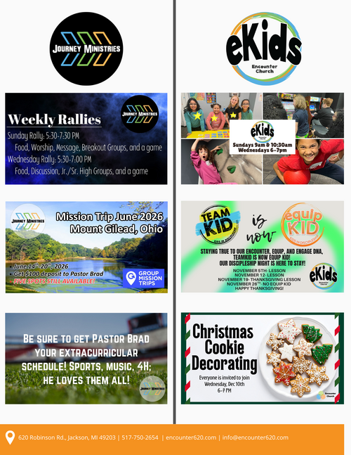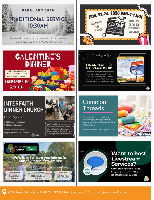 Thank you for your interest in Encounter Church. If you would like to receive email newsletters to keep up with everything going on at Encounter Church, please fill out the form below to be added to our email list.